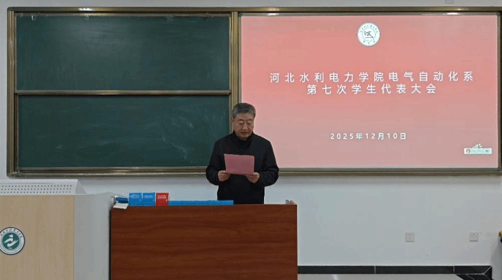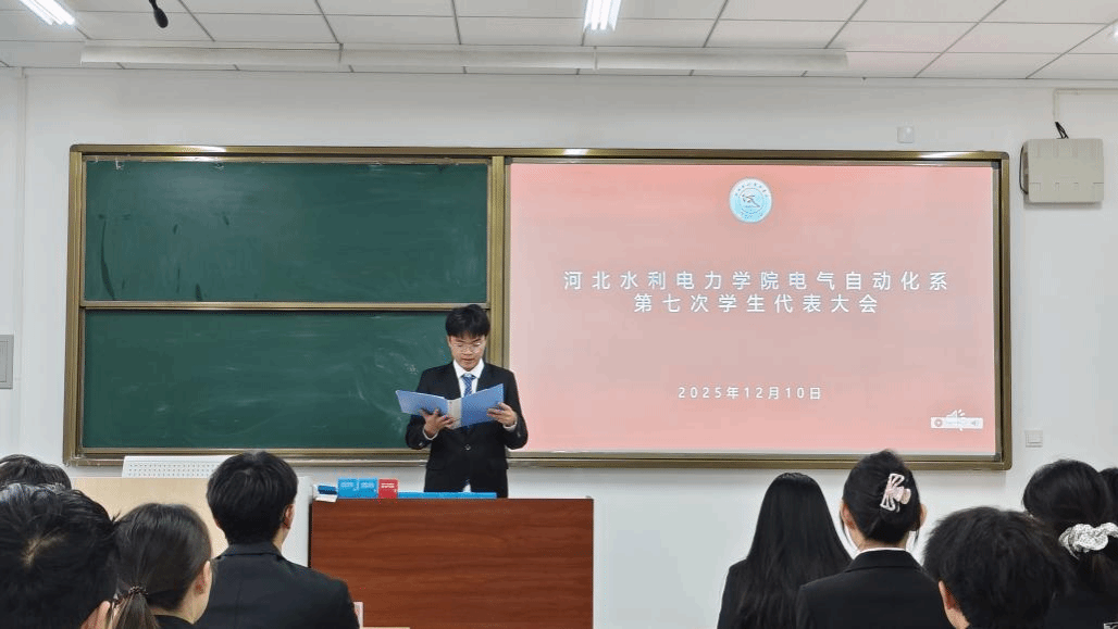 2025年12月10日,河北水利电力学院电气自动化系第七次学生代表大会于求是楼C404召开。全系共计40名学生代表参加会议。电气自动化系党委书记葛洪伟、团委书记张宁、辅导员王静静出席会议。